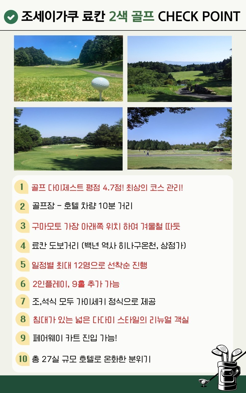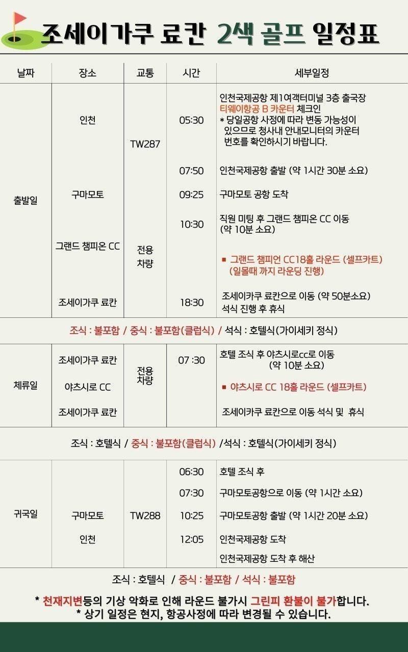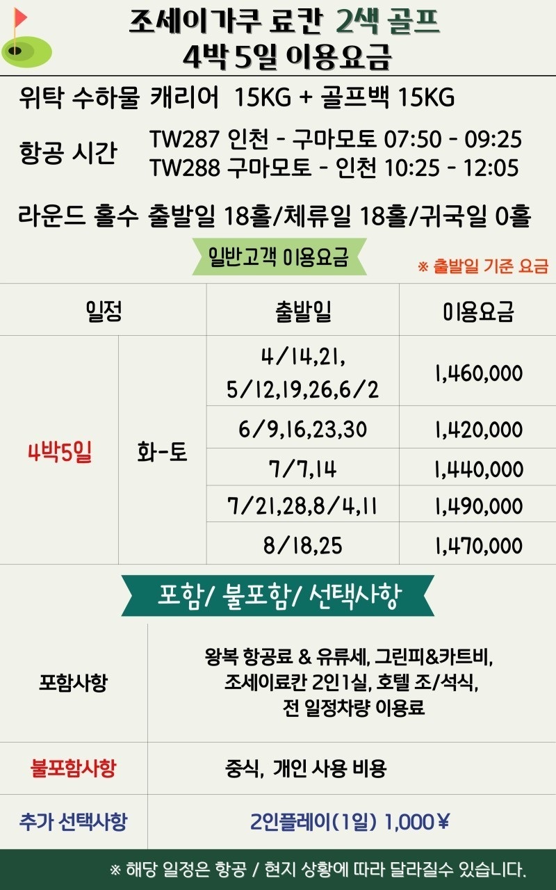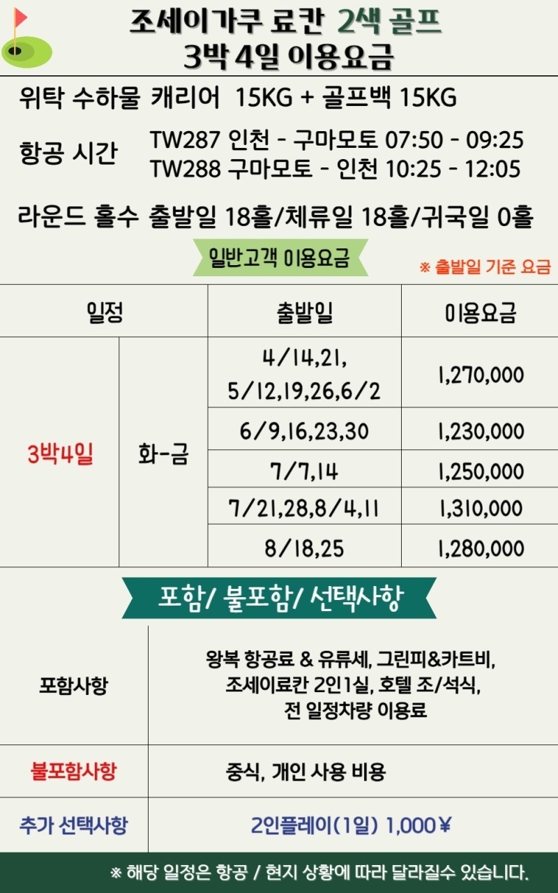 ·포함내역 왕복 항공권, 온천료칸숙박(2인 1실), 호텔조식+석식, 그린피+카트피, 송영차량비, 여행자보험