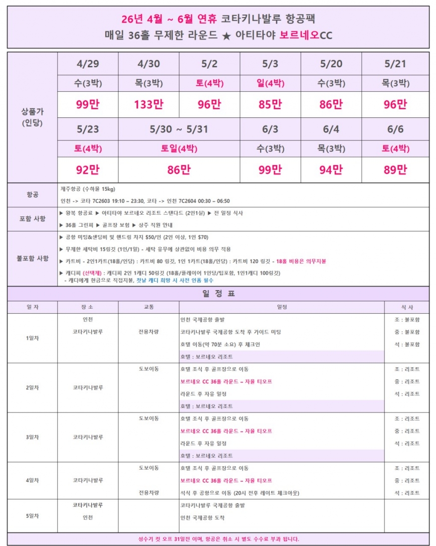 ·포함내역 왕복항공권, 리조트숙박, 전일정 식사, 그린피[36홀씩], 골프장보험, 관광세, 여행자보험